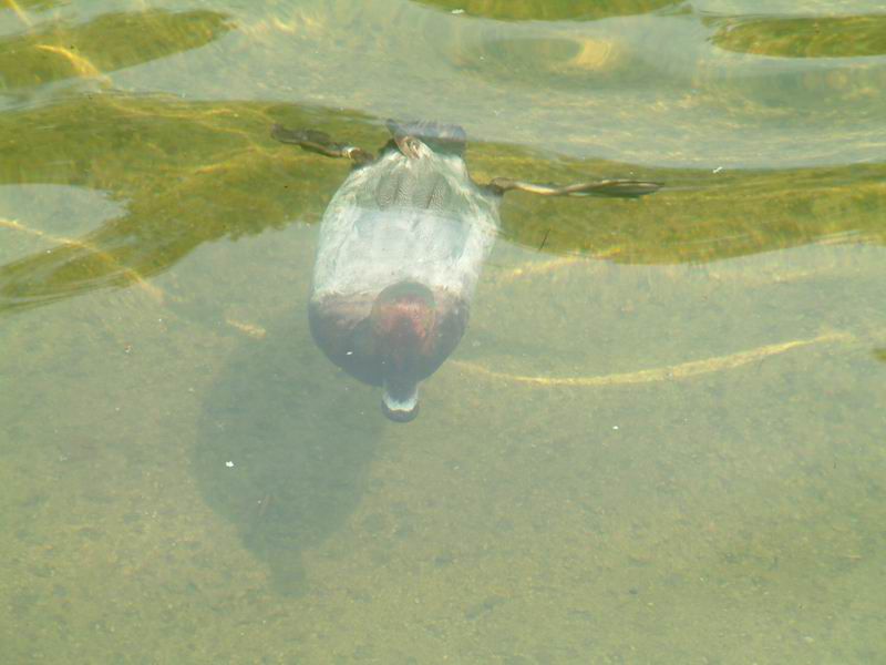 polák velký (Aythya ferina), potápějící se v kašně uprostřed parku v Bilbau.