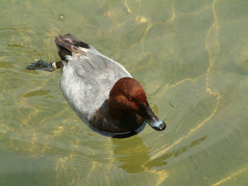 polák velký (Aythya ferina), zrovna se nepotápějící v kašně uprostřed parku v Bilbau.
