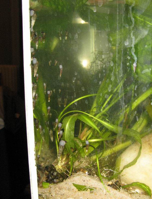 Piskořky hrbolkovité (Melanoides tuberculatus) v šoku z nového prostředí prchají do jednoho rohu. Zajímavé.