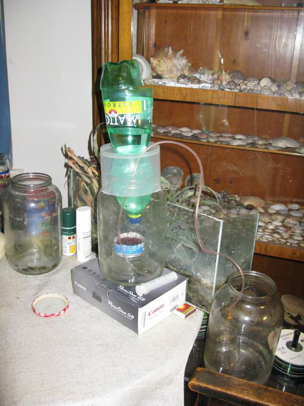 Důmyslný mechanismus na udržování čerstvých nitěnek. Nitěnky jsou umístěny v kelímku uvnitř nádoby postavené na podstavci pod petlahví s provrtaným víčkem a seříznutým dnem, ze kterého na nitěnky odkapává voda a přetéká do nádoby, odkud je možné ji vytvořením podtlaku nasátím vzduchu injekční stříkačkou z druhého konce hadičky při dostatečném sklonu a výšce nádob odvádět do rezervoáru. Voda vydrží kapat i několik hodin, stačí doplňovat ráno a večer. Experimentálně ověřeno, že stejného efektu na životnost lze dosáhnout tím, že se jim prostě ráno a večer normálně vymění voda. No nic.