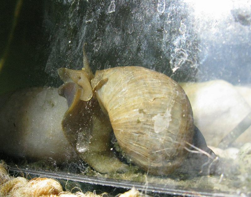Plovatka bahenní (Lymnaea stagnalis), velmi špinavé sklo, fuj